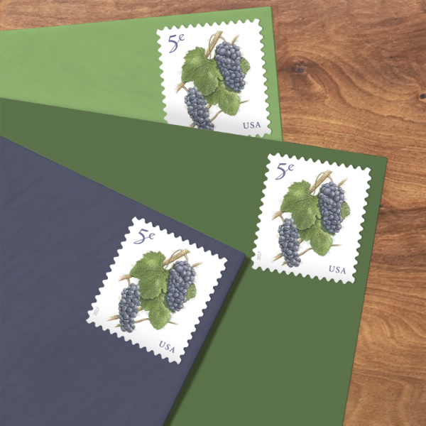 This is the 5¢ additional postageGrapes Stamp, available in a sheet of 20.Denominated rates guarantee postage at the face value and should be used as additional postage for oversized, overweight, or o